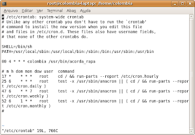 E só lembrando, primeiro coloca-se os minutos e depois a hora. Quanto ao usuário eu optei por não colocar o root pq na hora de desligar o som eu teria que me logar como root para desligar o “despertador”.